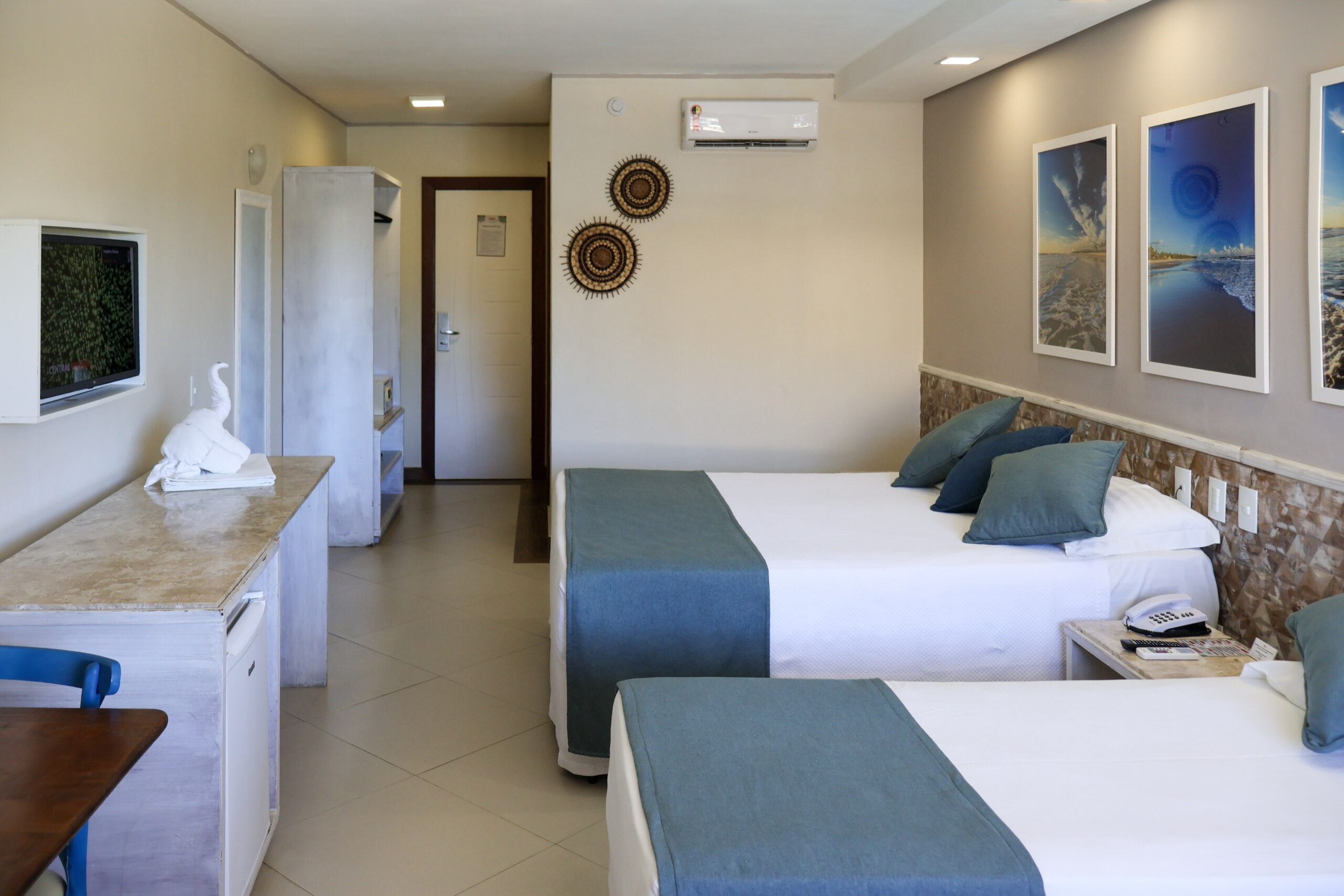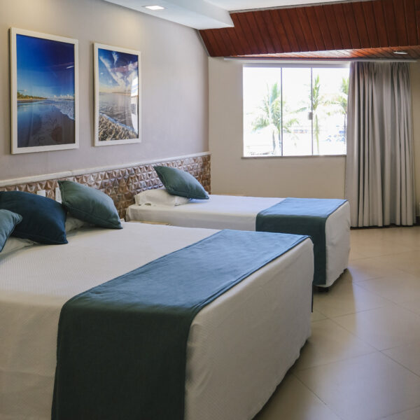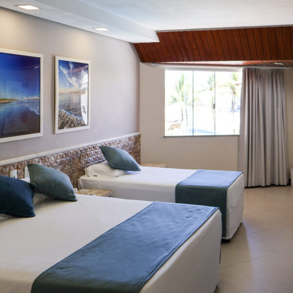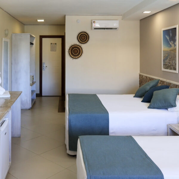 Conta ainda com ar-condicionado split, TV, frigobar, cofre eletrônico, além de mesa com duas cadeiras, garantindo praticidade durante a estadia. O banheiro é privativo e equipado para oferecer ainda mais comodidade.