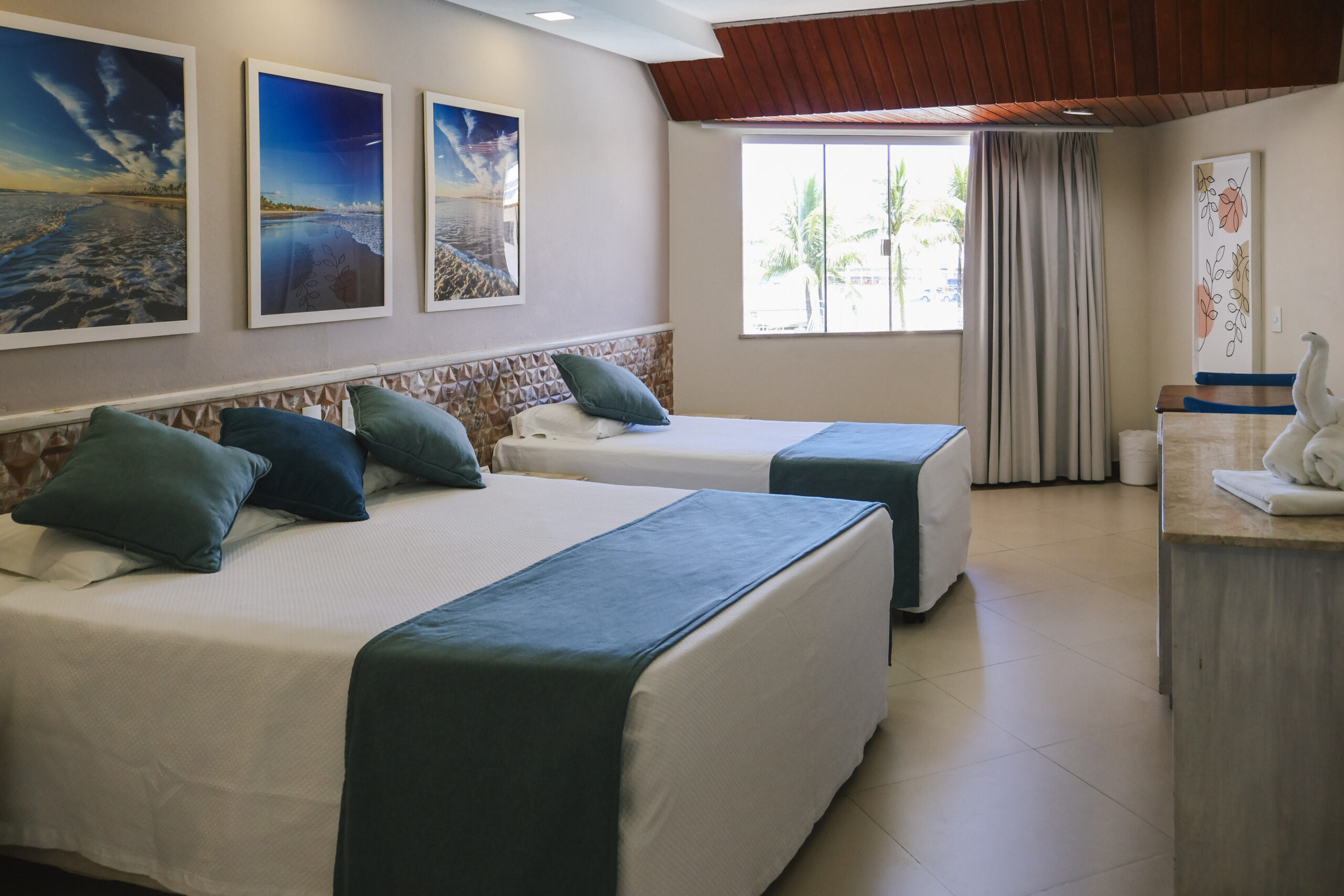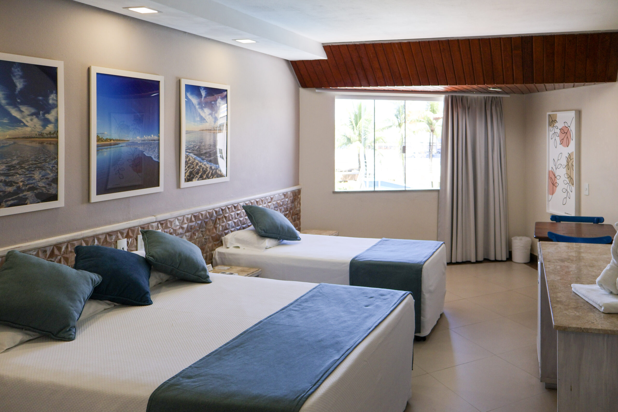 A acomodação possui opções que atendem até 3 pessoas, com uma cama de casal tamanho queen e uma cama de solteiro, ou até 4 pessoas, com uma cama de casal tamanho queen e duas camas de solteiro.